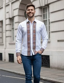 Su corte clásico con cuello tipo Mao o camisero y botones de contraste hacen de estas camisas prendas versátiles, ideales tanto para ocasiones formales como para un estilo casual refinado.