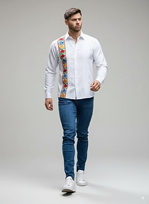 Camisas de lino con finos pliegues al frente, realzadas con bordados artesanales de inspiración cultural. Cada pieza combina modernidad y tradición, con detalles únicos en tonos vibrantes como azul, verde, negro y turquesa.